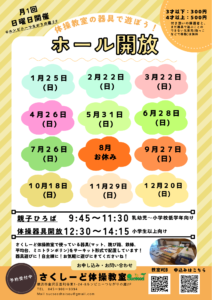 2月のホール開放(親子ひろば・体操器具開放)の実施日は以下のとおりです!